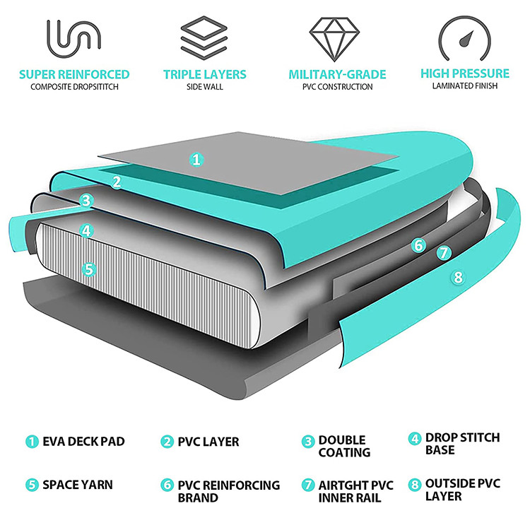 : Sono fatti da un PVC che usa qualcosa «costruzione chiamata del punto del calo» che quando ottiene gonfiata ottiene molto rigido, simile ad un bordo di pagaia a resina epossidica tradizionale.